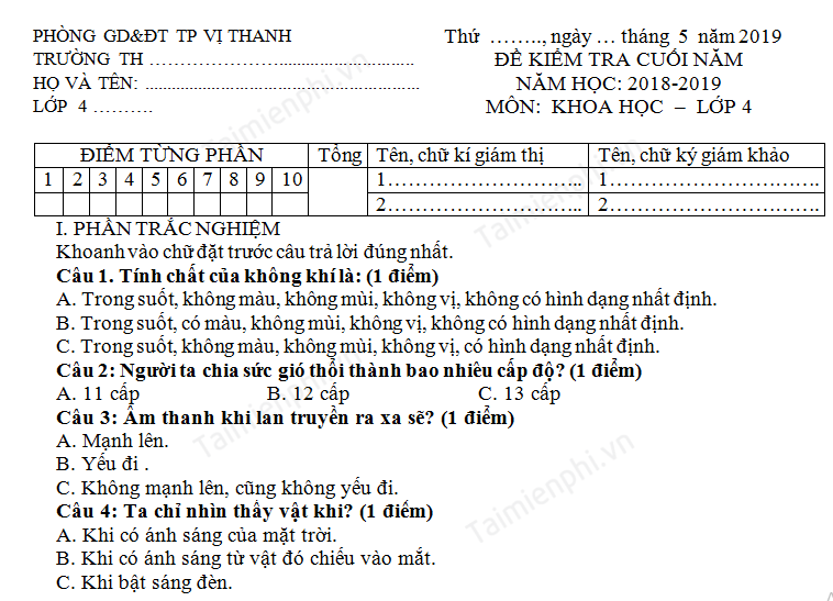- Đề thi học kì 2 môn Khoa học lớp 4 Đề số 1