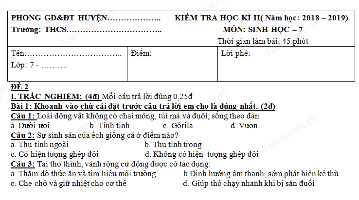 Tải đề thi học kì 2 môn Sinh học lớp 7