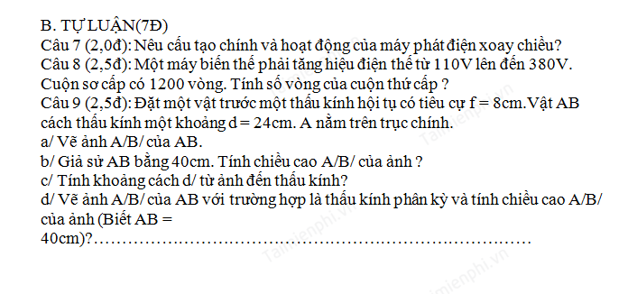 Tải đề thi học kì 2 môn Vật lý lớp 9 có đáp án