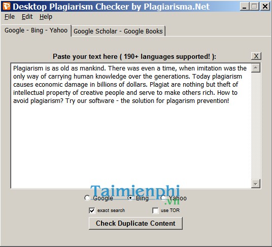 Desktop Plagiarism Checker hỗ trợ thầy cô giáo phát hiện các đoạn văn được sao chép trên internet của học sinh, sinh viên, giúp các nhà quản lý phát hiện các nhân viên thực hiện việc sao chép bài trên các website, diễn đàn khác, để từ đó có những hình phạt nghiêm khắc giúp học sinh, sinh viên, nhân viên không tái phạm vào lần sau