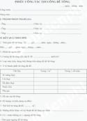 Ngoài ra, mẫu phiếu công tác thi công bê tông cần nêu rõ khối lượng vật liệu sử dụng trong mỗi m3 bê tông, trong một cối trộn, độ sụt của bê tông, số lượng và kiểu dụng cụ đầm, thể tích bê tông đã đổ. Qua các nội dung này đưa ra nhận xét và kết luận trong phần 3 xem công tác thi công bê tông có đạt chất lượng theo yêu cầu bản vẽ thi công hay không.