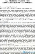 Trước tiên, nhân ngày Nhà giáo Việt Nam 20-11, tôi xin kính chúc quí thầy cô giáo, các bạn bè đồng nghiệp lời chúc sức khỏe , hạnh phúc và đặc biệt là ngày càng có nhiều thế hệ học trò học giỏi, chăm ngoan. Và nhân đây tôi cũng xin được cảm ơn BGH, BCH công đoàn nhà trường đã cho tôi cơ hội để nói những lời tri ân với quí thầy cô giáo, đồng thời gửi gắm đôi điều nhắn nhủ tới các em học sinh.