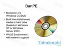 BartPE Bootable Live Windows CD/DVD có thể sử dụng với nhiều hệ điều hành windows 32 bit như Windows XP, Windows server 2000/ 2003 phù hợp với tất cả các định dạng ổ đĩa FAT, NTFS hoặc CDFS với khả năng khởi động máy tính ngay lập tức