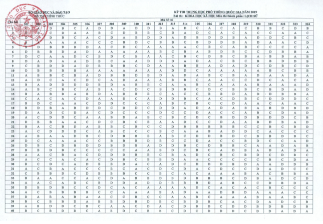Đáp án môn Lịch sử THPT năm 2019 (mã đề 324)