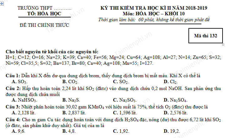 Đề thi học kì 2 môn Hóa học lớp 10 năm 2019 mới nhất được Taimienphi.vn sưu tầm và đăng tải nhằm mang đến cho các bạn học sinh tài liệu học tập chất lượng, hữu ích nhất, đặc biệt là trong giai đoạn ôn thi học kì 2 này.