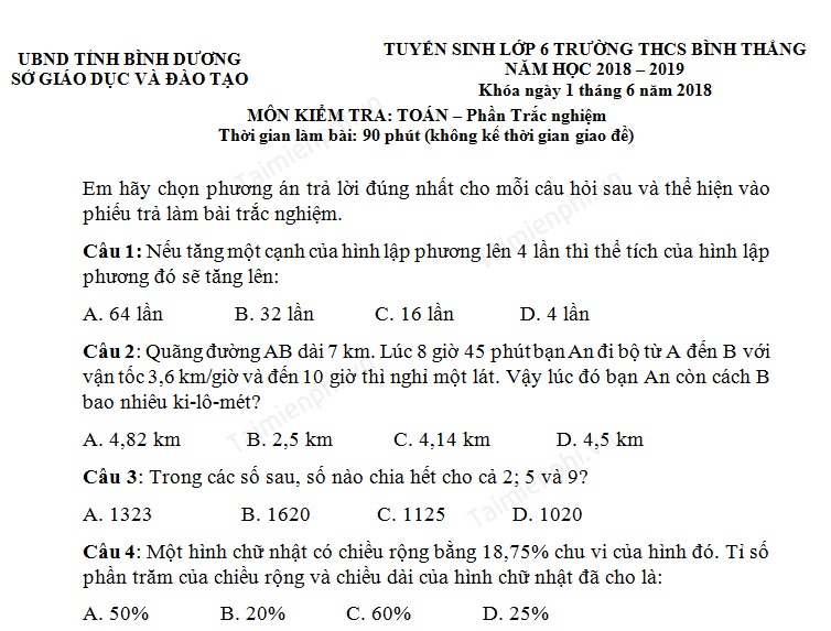 Đề thi tuyển sinh vào lớp 6 môn Toán phần trắc nghiệm gồm các câu hỏi dạng ngắn, lựa chọn các đáp án đúng trong 4 đáp án đã cho. Những kiến thức này thuộc cả toán số lẫn hình học, tổng hợp các kiến thức tiểu học, chủ yếu là lớp 5. Dạng trắc nghiệm này đòi hỏi học sinh phải có trí nhớ tốt với các kiến thức đã học, tư duy nhạy bén, tính toán nhanh.