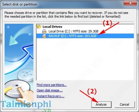 Bước 2: Sau khi cài đặt xong, khởi động phần mềm lên bạn sẽ thấy xuất hiện một cửa sổ cho phép chọn ổ đĩa cần quét dữ liệu. Bạn chọn ổ đĩa muốn quét để khôi phục dữ liệu bị mất trên đó và nhấn vào Analyze để phần mềm tự động phân tích.