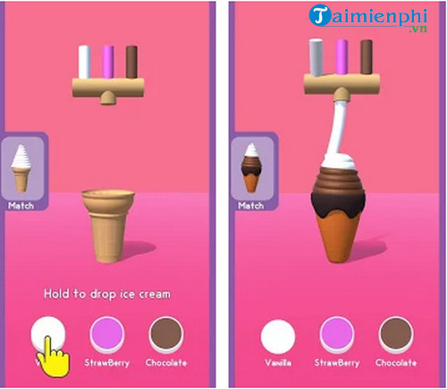 Trên màn hình, bạn sẽ có 3 nút bấm tương ứng với 3 vị kem khác nhau, và đó cũng là 3 nút điều khiển của game. Bạn sẽ cần nhìn vào order của khách hàng và bấm nút để lấy vị kem chuẩn theo yêu cầu của mỗi người. Bạn biết đấy, kem ốc quế thường có nhiều tầng hay vòng xoắn và bạn cần phải lấy đủ số vòng xoắn của mỗi vị. Chẳng hạn như, cây kem ốc quế có 10 tầng và khách hàng của bạn order cây kem có 3 tầng vị sô cô la, 3 tầng vị trà xanh và 4 tầng vị bạc hà, bạn sẽ phải làm ra que kem đúng với order như vậy, đơn giản bằng cách ấn giữ nút cho dòng kem tuôn ra và tạo thành các tầng. Khi đủ số tầng của vị kem này, bạn chỉ cần thả tay và chuyển sang vị kem tiếp theo.