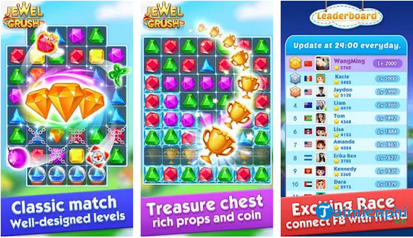 Jewel CrushTM là một game giải đố Match 3 mang đến cho bạn những trải nghiệm chơi game kim cương tuyệt vời, đầy thư giãn và vui vẻ. Với hơn 2000 cấp độ tinh tế và lối chơi giải đố Match 3 phổ biến nhất, bạn sẽ đấu với bạn bè từ khắp nơi trên thế giới. Bạn sẽ đồng hành cùng nàng công chúa dễ thương và lao vào thế giới để kết hợp các viên đá quý, tạo lên các combo 3 viên cùng màu trở lên để phá huỷ chúng và giành lấy điểm và các vật phẩm giá trị. Về cơ bản, lối chơi gần giống như các game kim cương, game giải đố Match 3.