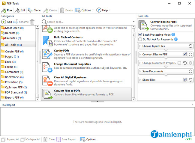 Có rất nhiều tùy chọn cấu hình, người dùng có thể tùy thuộc vào tính chất công việc mà sử dụng PDFTools , bao gồm các tùy chỉnh cơ bản, tạo mật khẩu, chèn dấu bản quyền Watermark và nén file PDF.