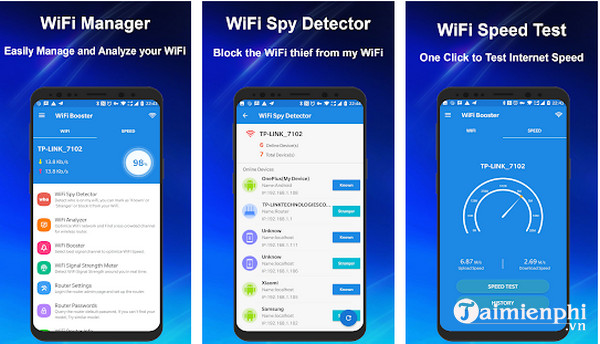 WiFi Manager cho Android là một công cụ miễn phí và tiện dụng để người dùng phân tích và tăng tốc mạng wifi. Công cụ này hoạt động như một trình phát hiện gián điệp wifi, kiểm tra tốc độ wifi, phân tích mạng wifi, tăng tốc wifi, đo cường độ tín hiệu wifi, bảo mật wifi và đánh giá các mạng wifi, ...